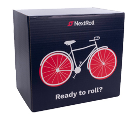 Full color printing is used to emphasize the fun welcome message on the top of the box in this NextRoll new hire kit