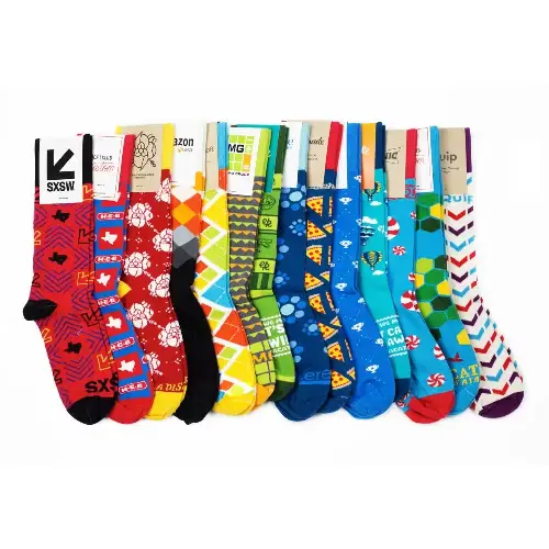 Our custom crew socks are super versatile – when buying custom socks in bulk, it can be a headache to think about ages, genders, and sizing- but with custom socks that’s not a problem whatsoever! We offer a one-size-fits-most sizing, along with free custom sock design services that ensure you’re getting the exact branded crew socks to show off your brand or event while also making something cool anyone can enjoy, after all, everyone wears socks!
