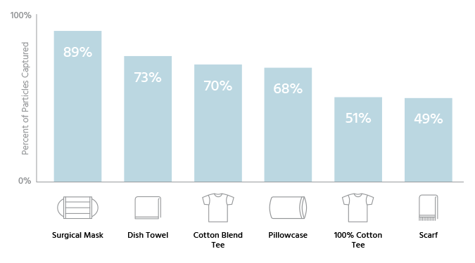 Researchers at Cambridge University tested a wide range of household materials for cloth face coverings. To measure effectiveness, they shot Bacillus atrophaeus bacteria (0.93-1.25 microns) and Bacteriophage MS virus (0.02 microns ins size) at different household materials.